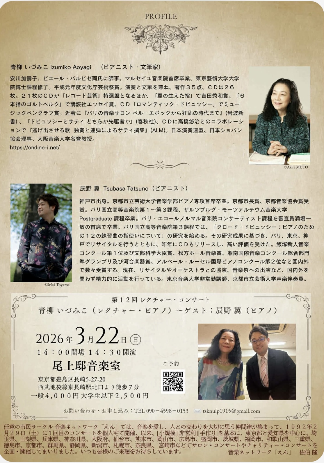 ドビュッシー研究30年のピアニスト・文筆家、青柳いづみことドビュッシー全曲演奏をめざす俊英、辰野翼の「えん」初出演。
